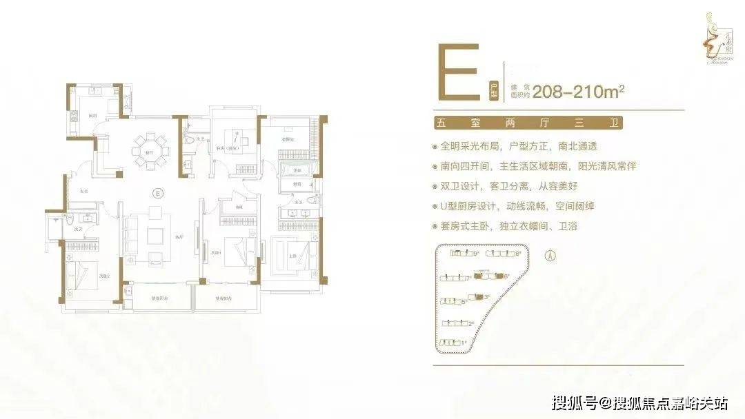 建面约208-210㎡五室两厅三卫户型特点:全明采光结构,